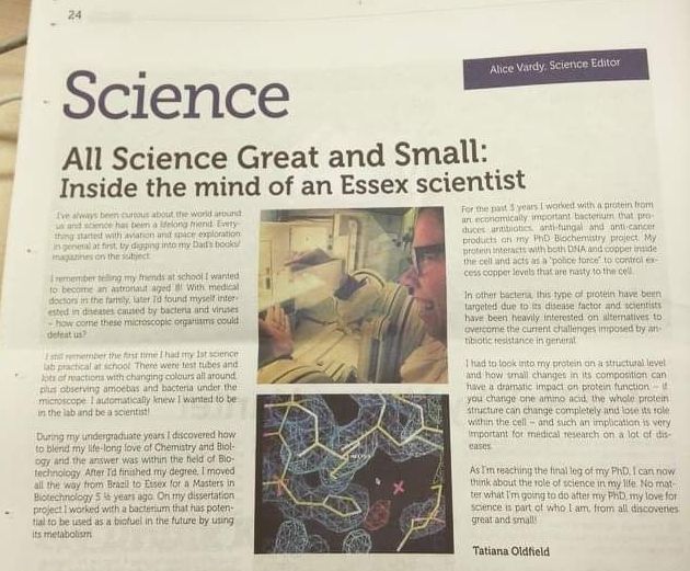 Em 2015, escrevi um artigo sobre minha carreira científica até então no jornal estudantil da minha universidade (The Rabbit – University of Essex) com o título All Science Great and Small, baseado na série original da BBC All Creatures Great and Small (1978 a 1990), inspirada nas experiências de James Herriot (pseudônimo do veterinário inglês Alf Wight), visto que minha história na ciência abrangia também as coisas maiores também – vide o doutorado.